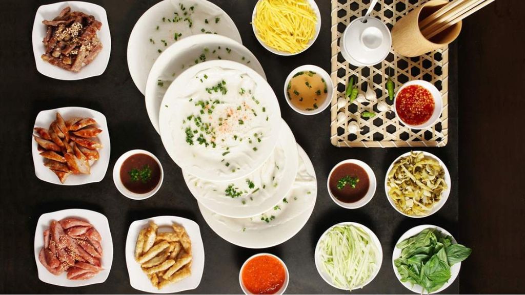 • Trên mỗi đĩa bánh ướt sẽ được rắc thêm mỡ hành, hẹ và bột tôm khô. Sau khi mang ra bàn, bạn tự do lựa chọn topping yêu thích, cuộn lại và thưởng thức.