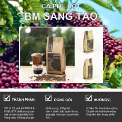 Cà phê bột ngyên chất Blend – BM Sáng Tạo với thành phần từ 100% hạt cà phê Robusta + Arabica hái chín, rang mộc nguyên chất. Được sản xuất công nghệ khép kín, rang xay không sử dụng phụ gia. Là dòng sản phẩm tạo ra hương vị mới lạ, độc đáo, mang lại cảm giác sảng khoái cho người sử dụng.